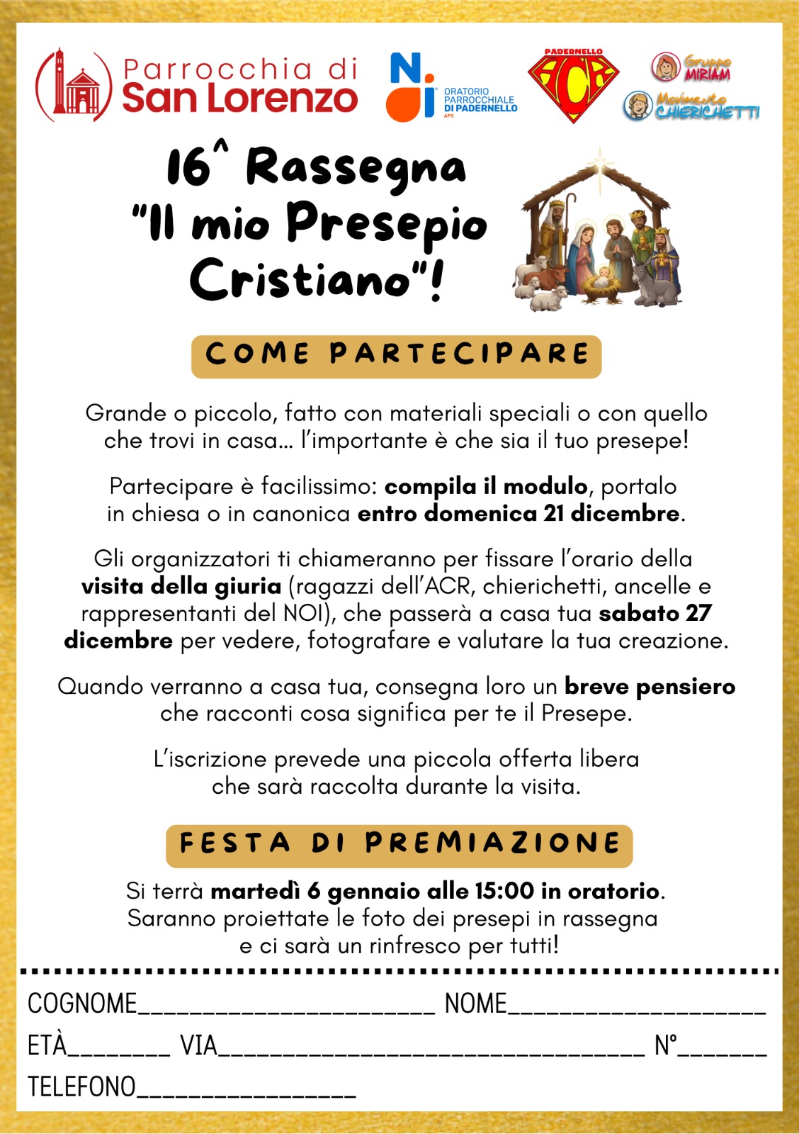 Anche quest’anno la Parrocchia di San Lorenzo di Padernello, insieme all’Oratorio NOI, all’ACR, al Gruppo Miriam e al gruppo Chierichetti e Ancelle, propone la 16ª Rassegna “Il mio Presepio Cristiano”, un’iniziativa che invita famiglie, bambini, ragazzi e adulti a riscoprire il significato autentico del Natale attraverso la tradizione del presepe.